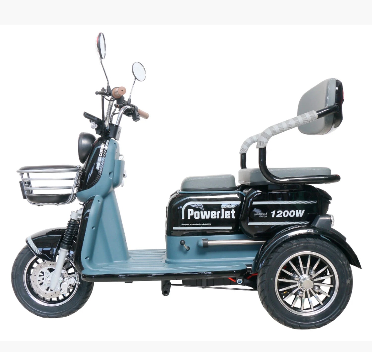 Трицикл Corso «POWER JET» JT-712387, двигун 1200W, акумулятор 72V 28Ah графеновий, чорний + 1 ящик. акум, колеса 10"