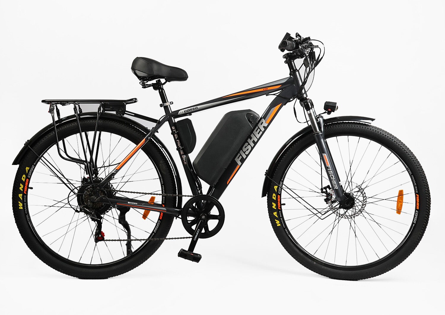 Електровелосипед 29 ST Corso «FISHER» FH-90855 сталь 21, двигун 600W, акумулятор 48V20Ah літієвий (к-т SHIMANO) графітово-помаранчевий