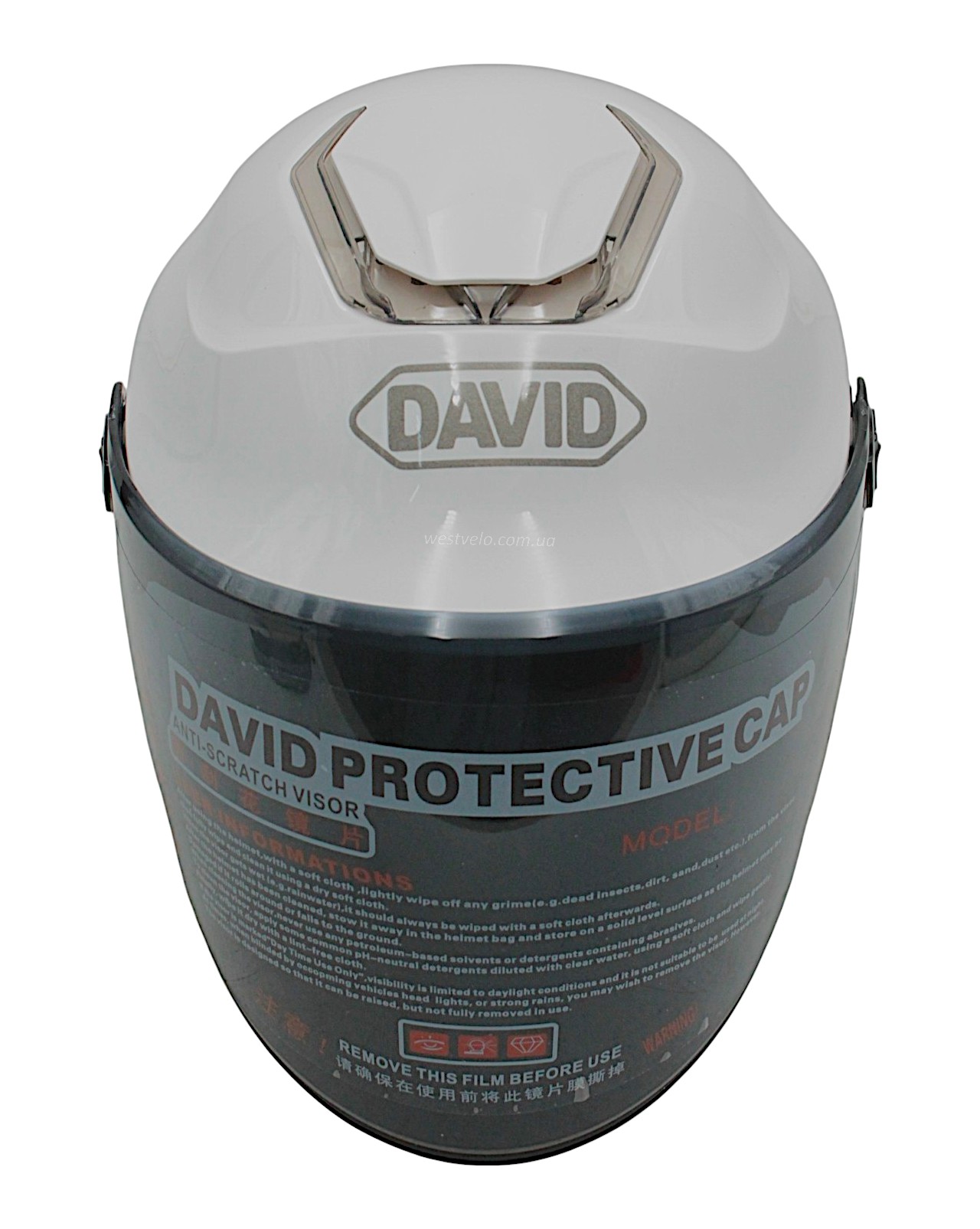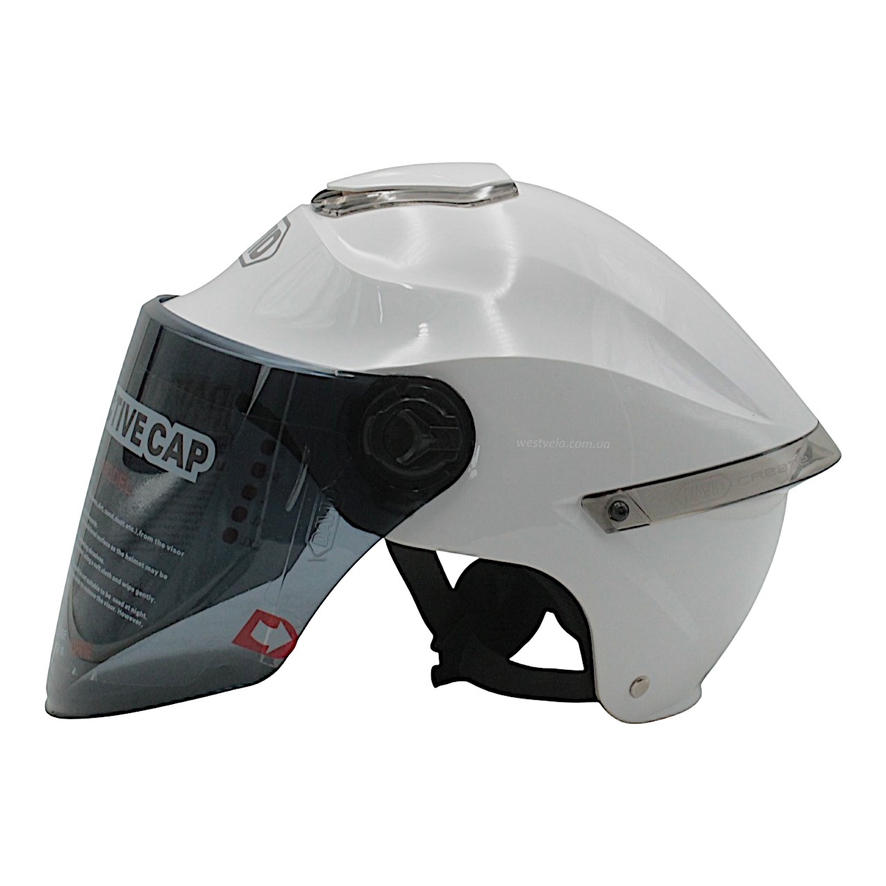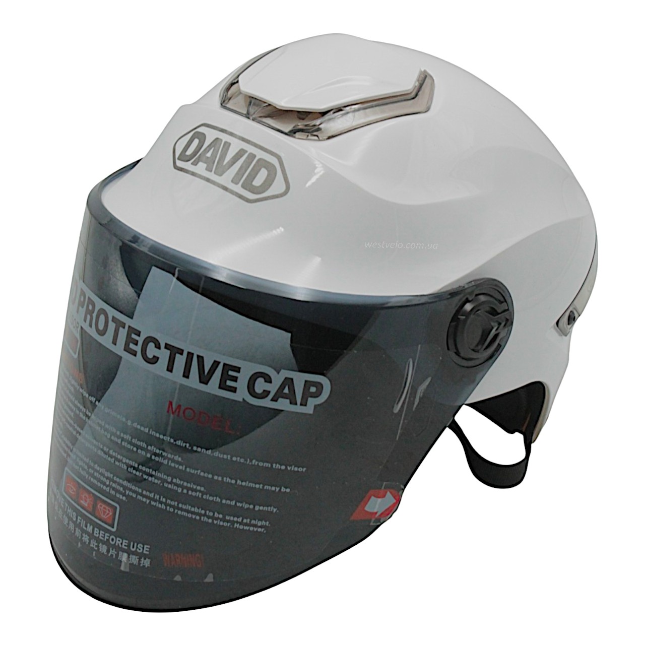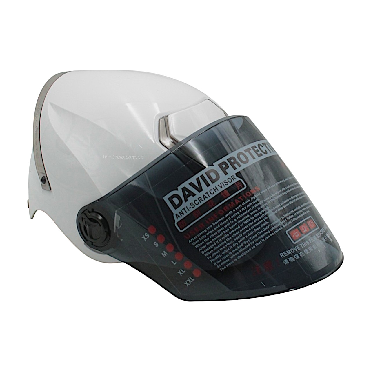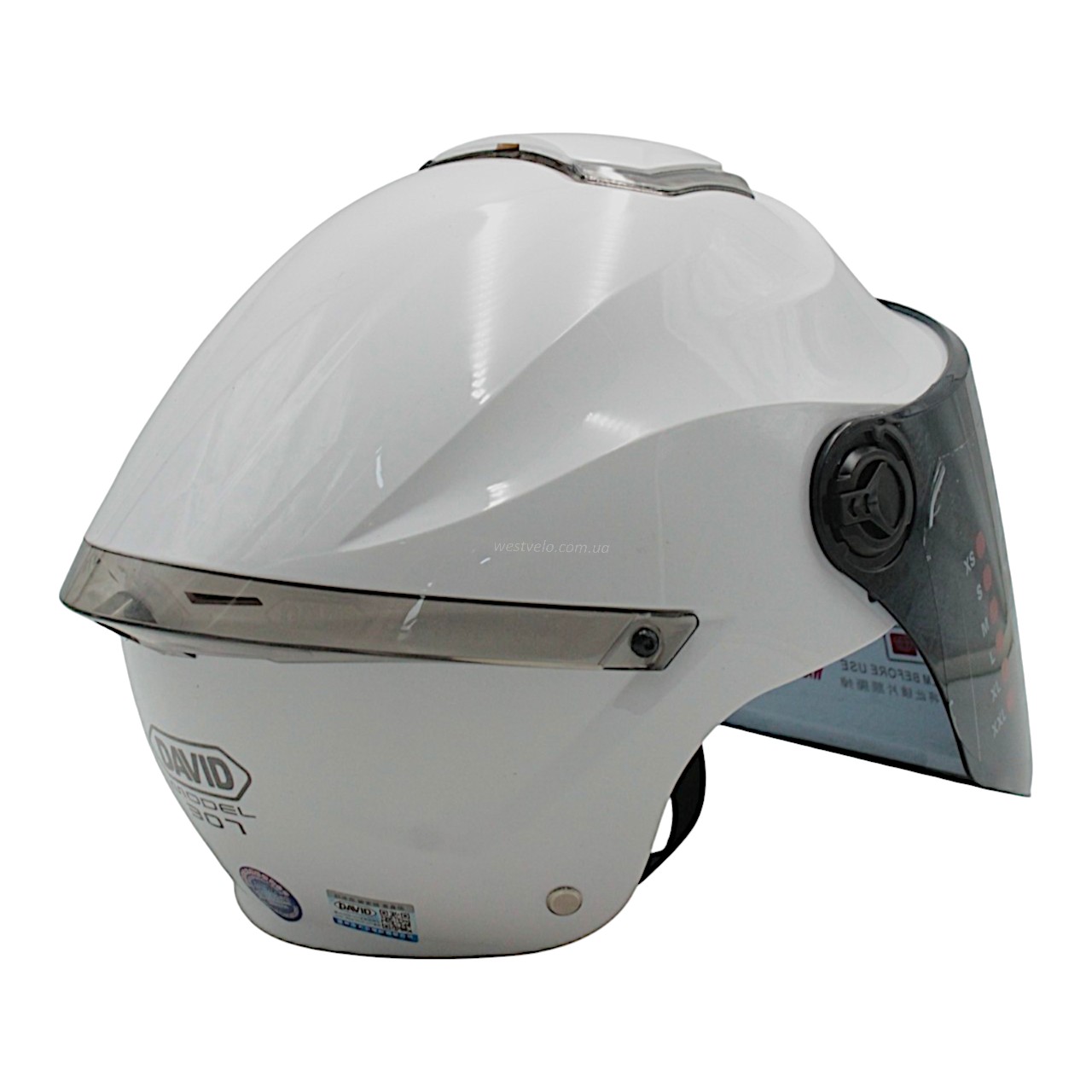 Мото шолом, відкритий "DAVID" S307, білий глянцевий тоноване скло, регулятор розміру з білим катафотом (ABS)