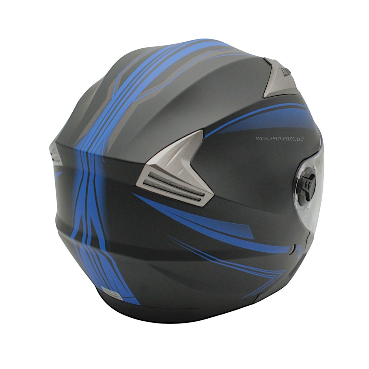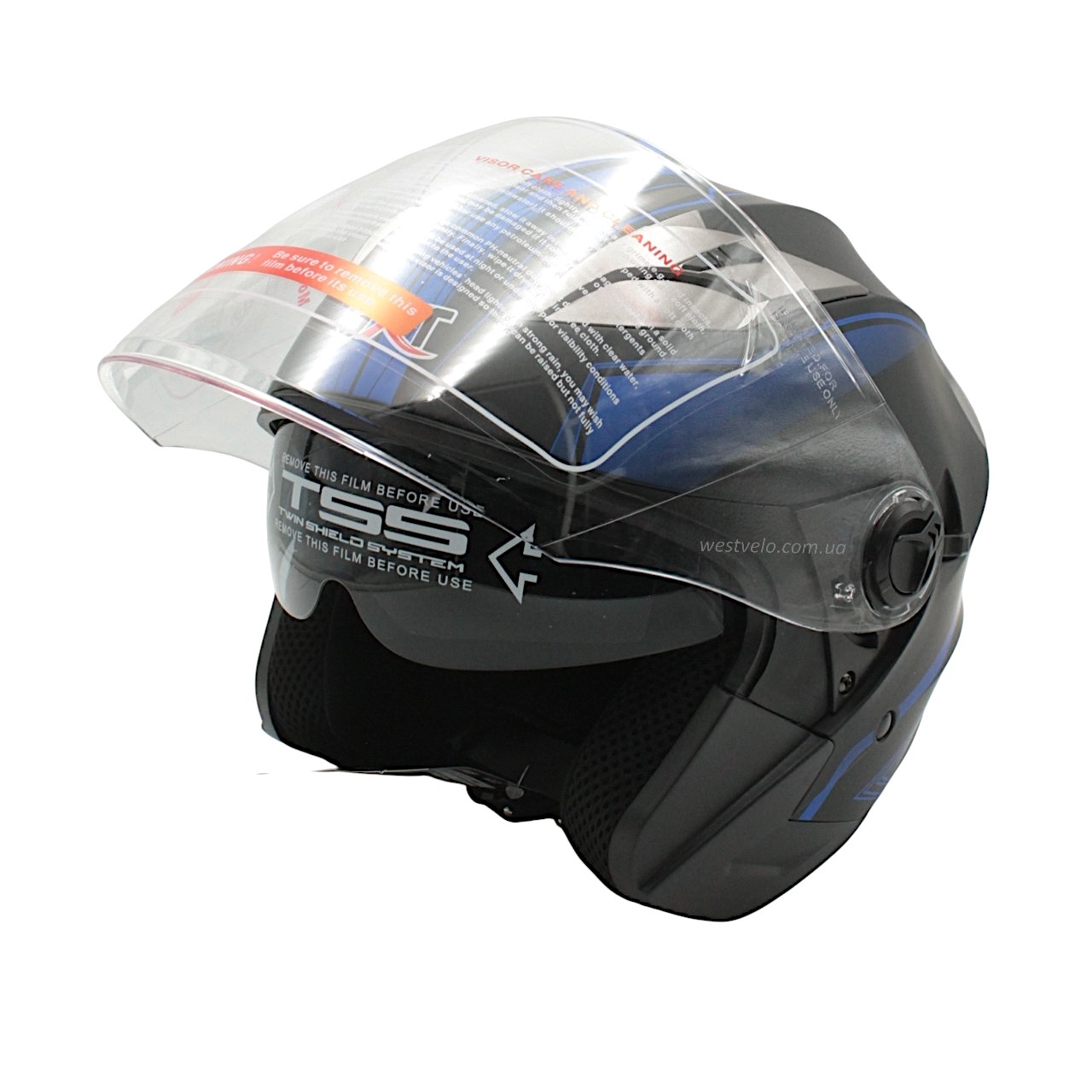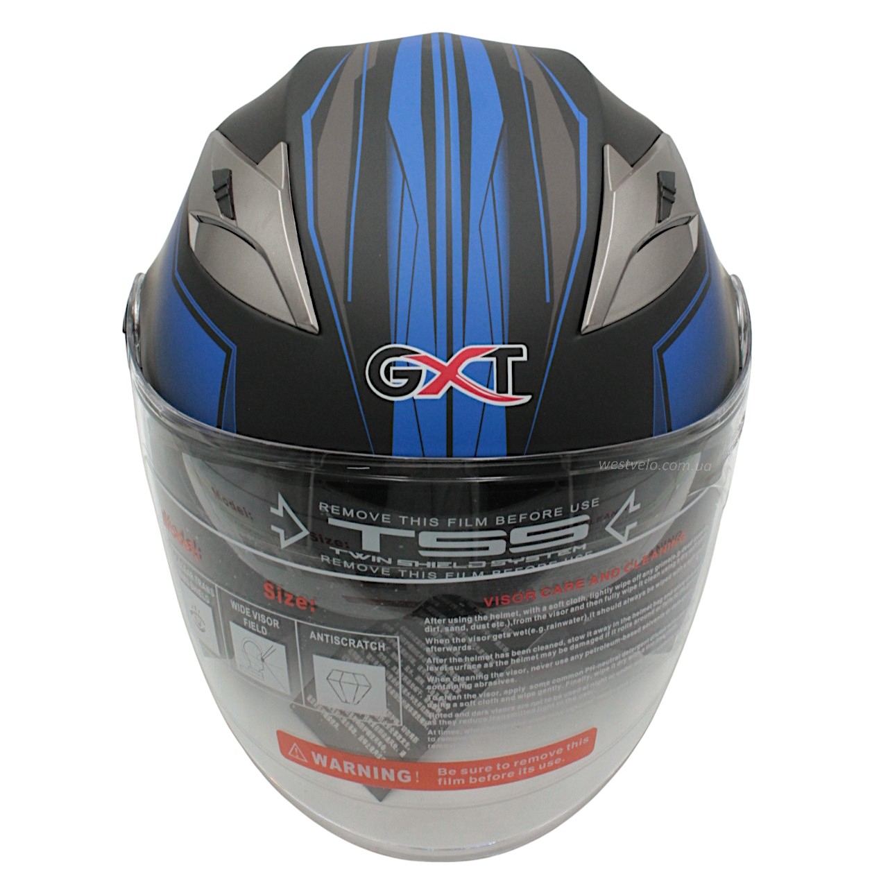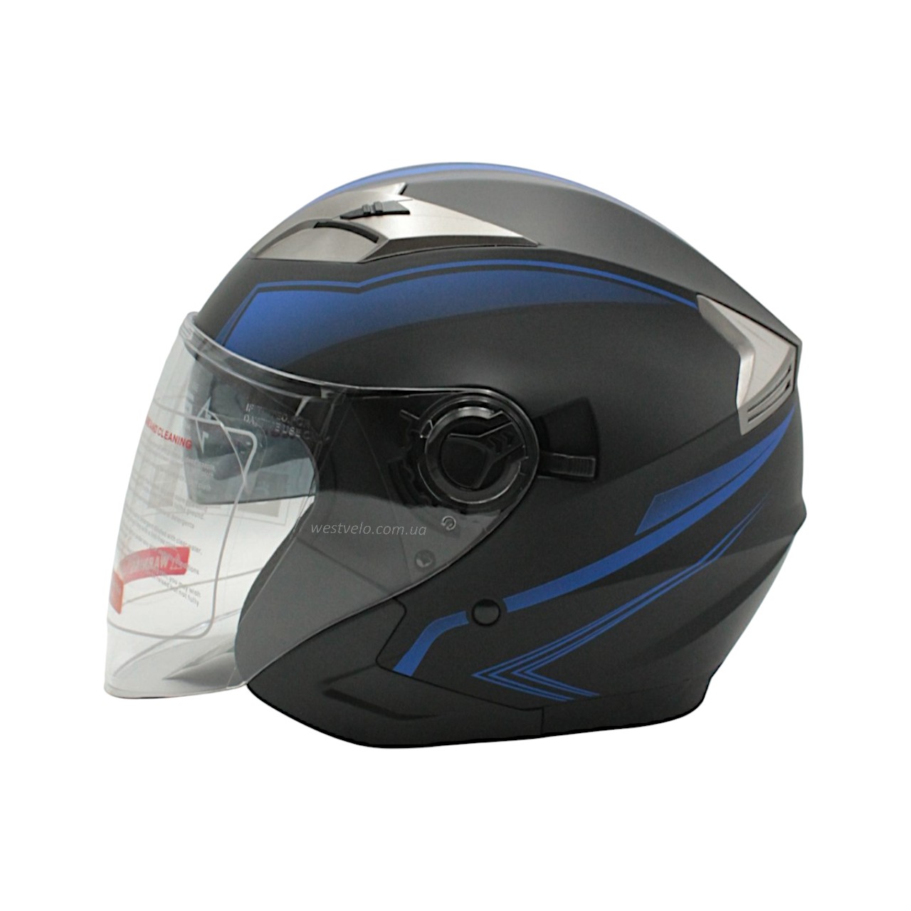 Мото шолом, відкритий (M) GXT "1001-1", чорний матовий з синіми вставками з відкидними окулярами