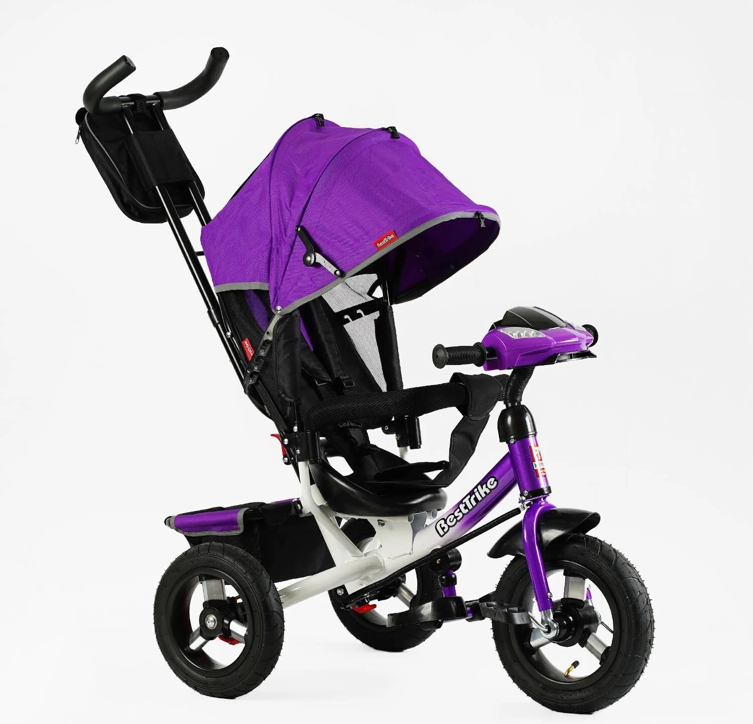 Дитячий велосипед 3-х колісний з батьківською ручкою, з дашком, надувні колеса Best Trike 3390 / 30-126 фіолетовий, d=29см. переднє, d = 26см. задні, ФАРА З USB, пульт