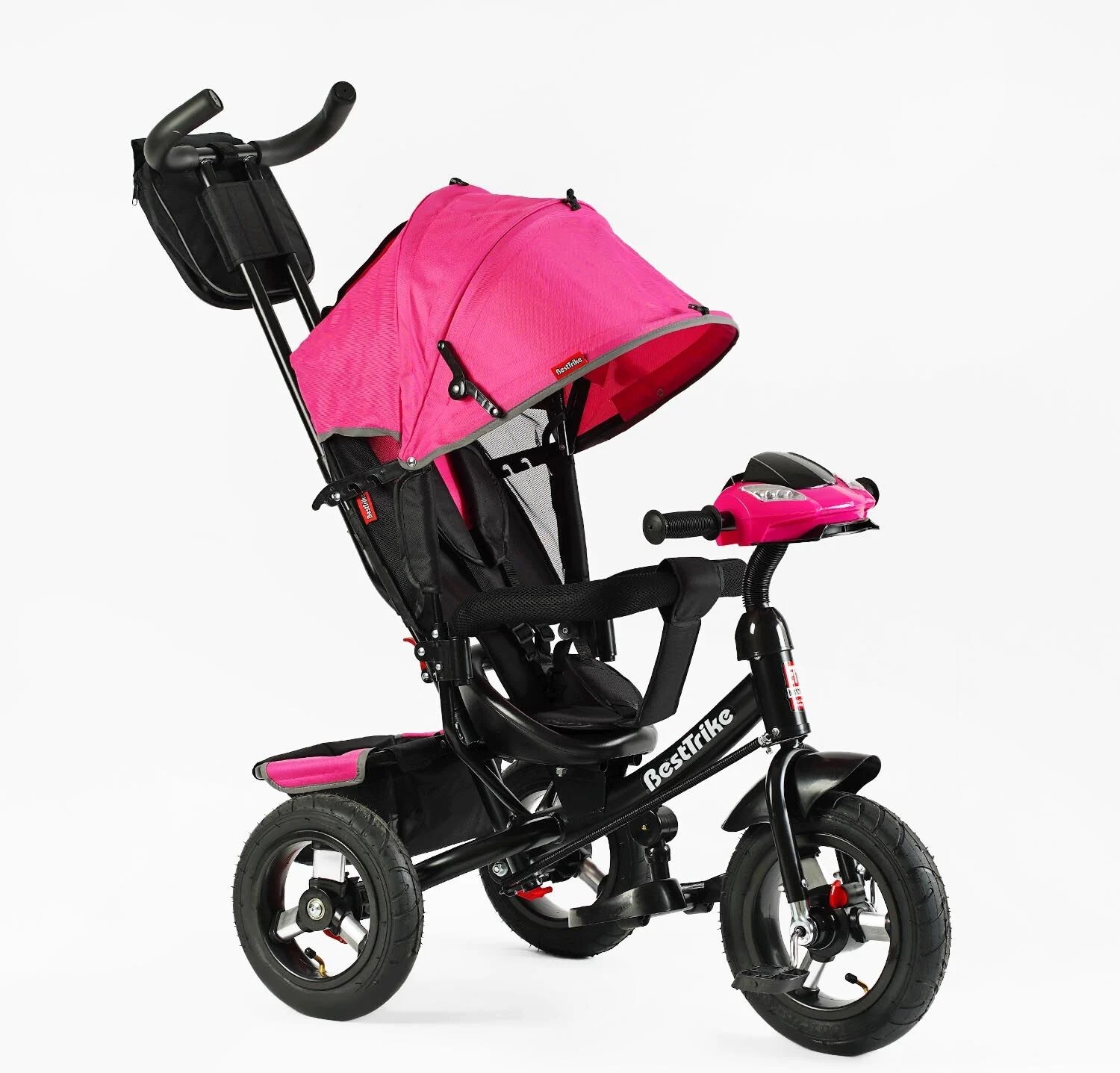 Дитячий велосипед 3-х колісний з батьківською ручкою, з дашком, надувні колеса Best Trike 3390/33-908 рожево-чорний, d=29см. переднє, d = 26см. задні, ФАРА З USB, пульт
