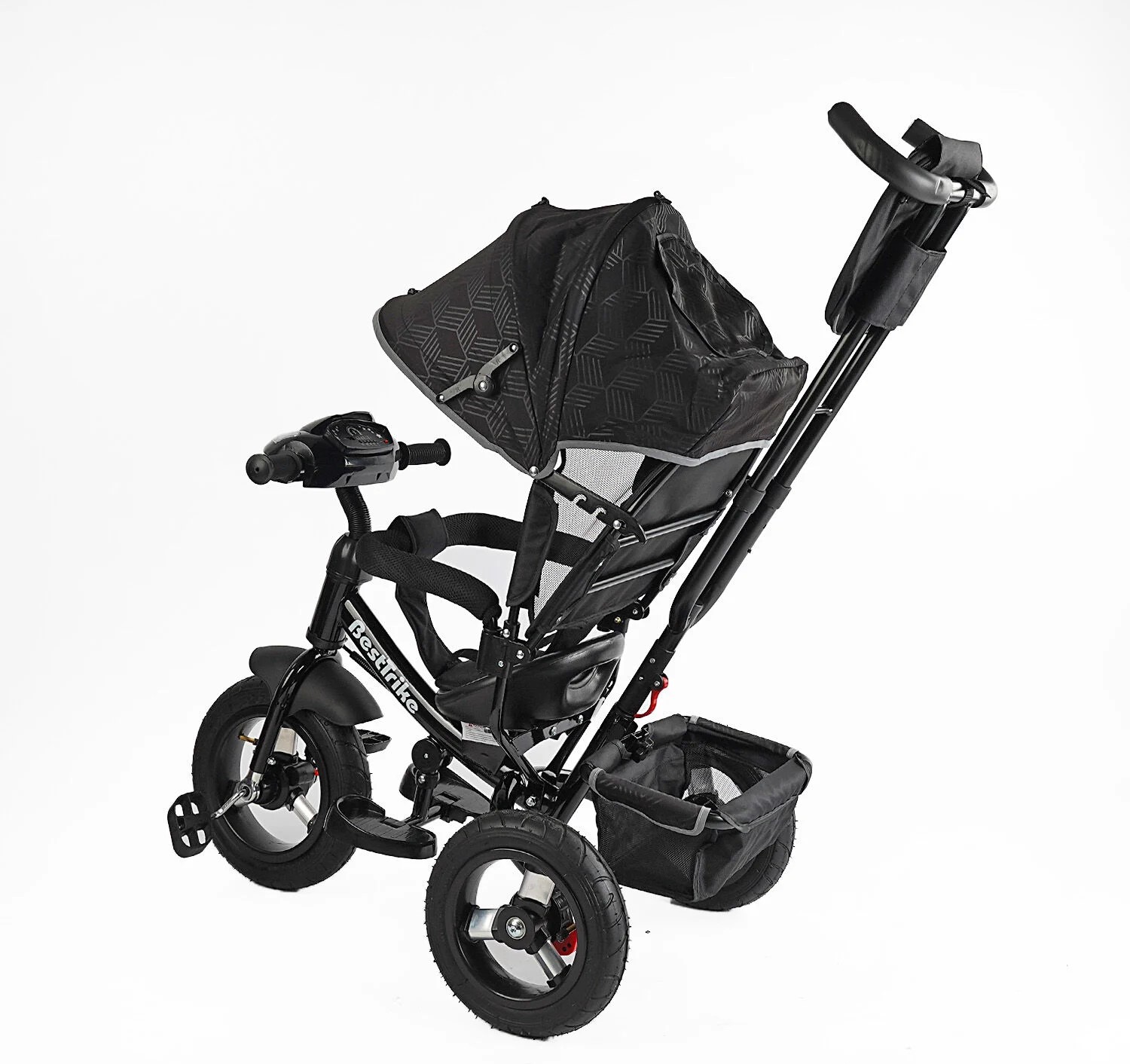 Дитячий велосипед 3-х колісний з батьківською ручкою, з дашком, надувні колеса Best Trike 3390/39-211 чорний, d=29см. переднє, d = 26см. задні, ФАРА З USB, пульт
