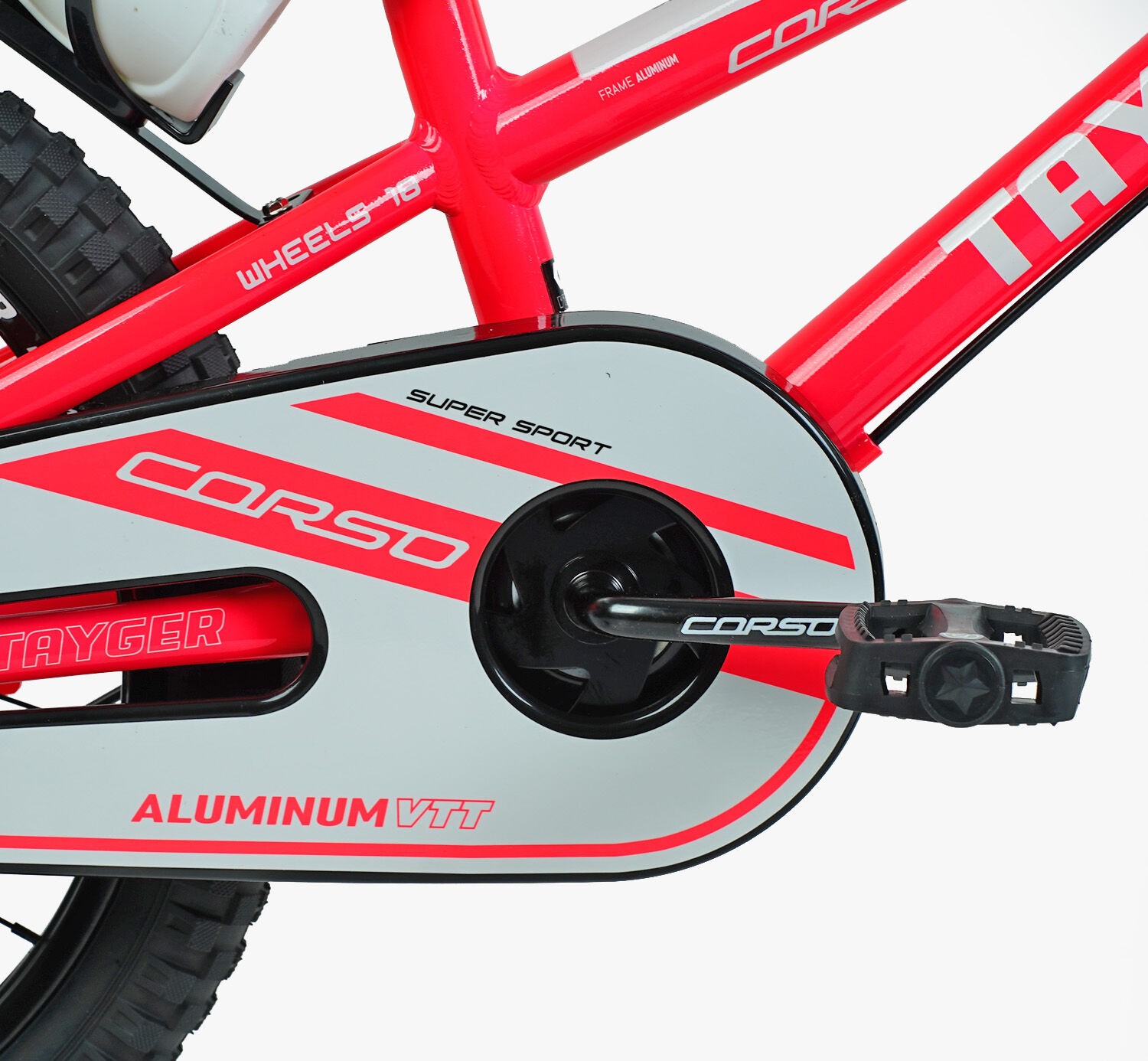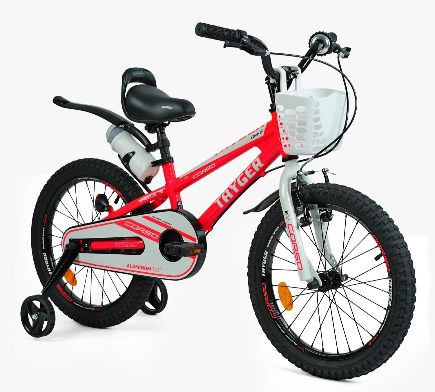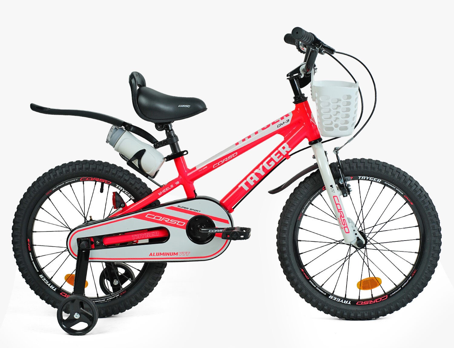 Дитячий велосипед 18 AL Corso «TAYGER» TG-36098 алюмінієва рама неоново-рожево-білий, ручне гальмо, дод. колеса, дзвоник, бутилочка