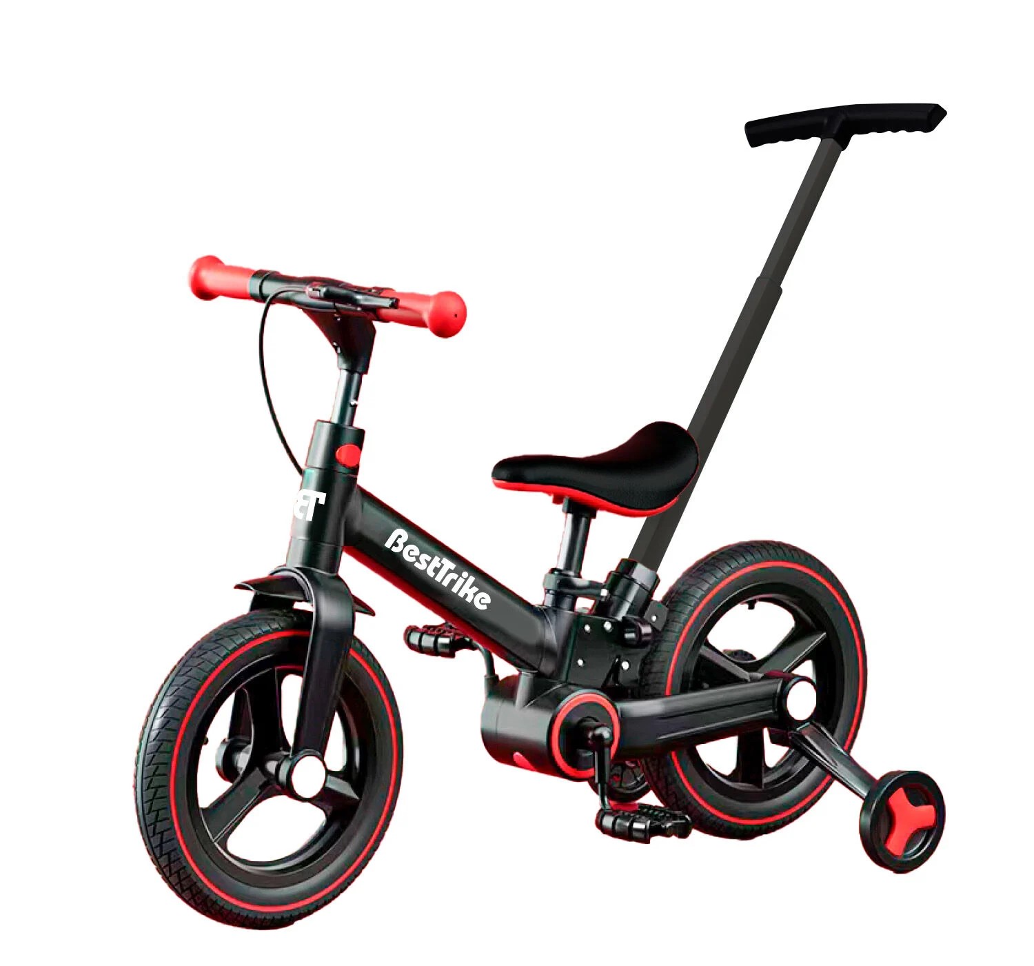 Велобіг-трансформер, 2-х колісний, з батьківською ручкою, PU 12 Best Trike BT-84119 чорно-червоний, складний, батьківська ручка, з’ємні педалі, ручне гальмо, допоміжні бокові колеса