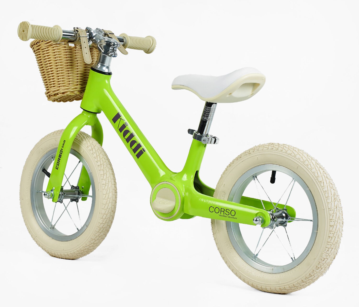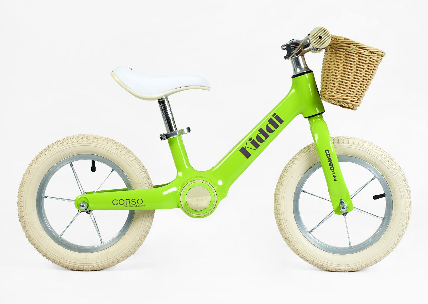 Велобіг 12 Corso надувні колеса, магнієва рама «KIDDI» ML-12328 салатовий, алюмінієві обода, підставка для ніг, корзинка
