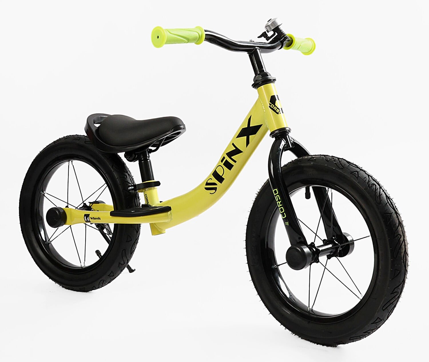 Велобіг 14 Corso надувні колеса, сталева рама «SPIN-X» PX-605-82 жовтий, підніжка, підставка для ніг, дзвіночок