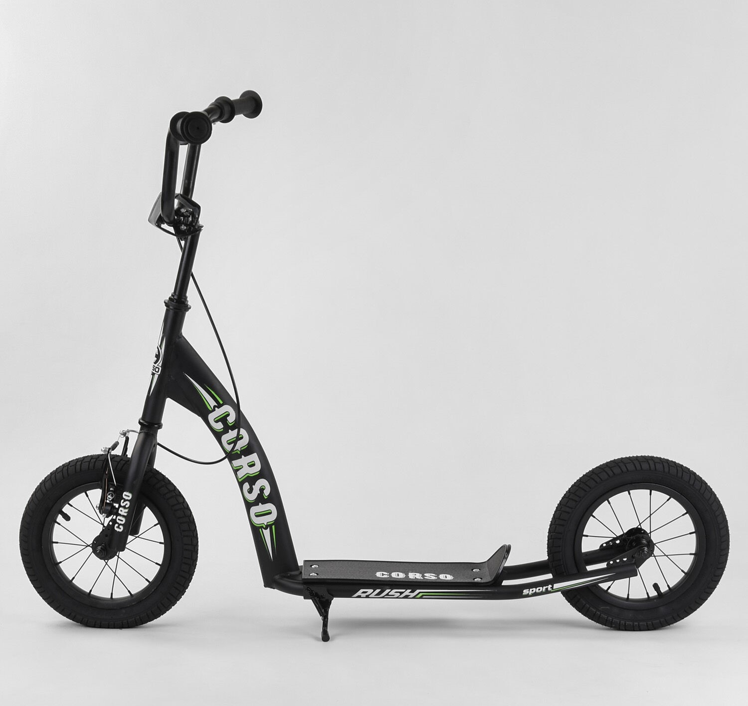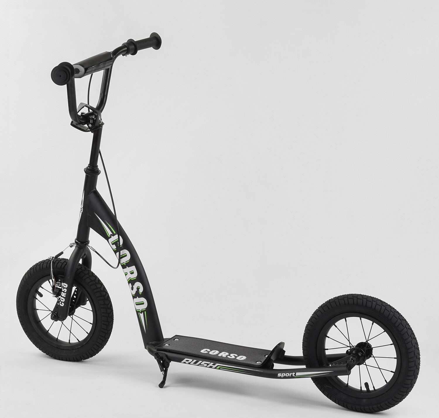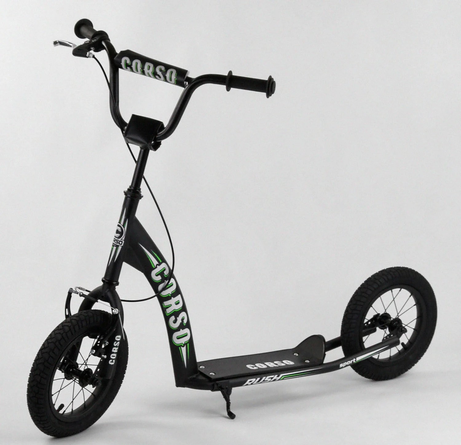 Самокат дитячий 2-х колісний, надувні колеса 12 Corso CR-T 0070 чорно-салатовий, ручне переднє гальмо
