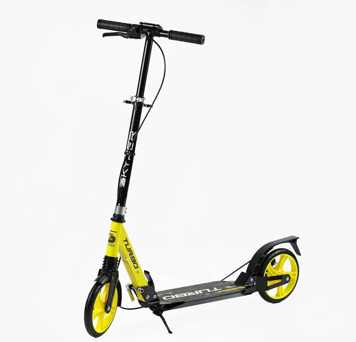 Самокат дитячий 2-х колісний, PU Skyper «TURBO» TR-23699 чорно-жовтий, колеса Ø200mm, сталева рама, ручне дискове гальмо, 2 амортизатори