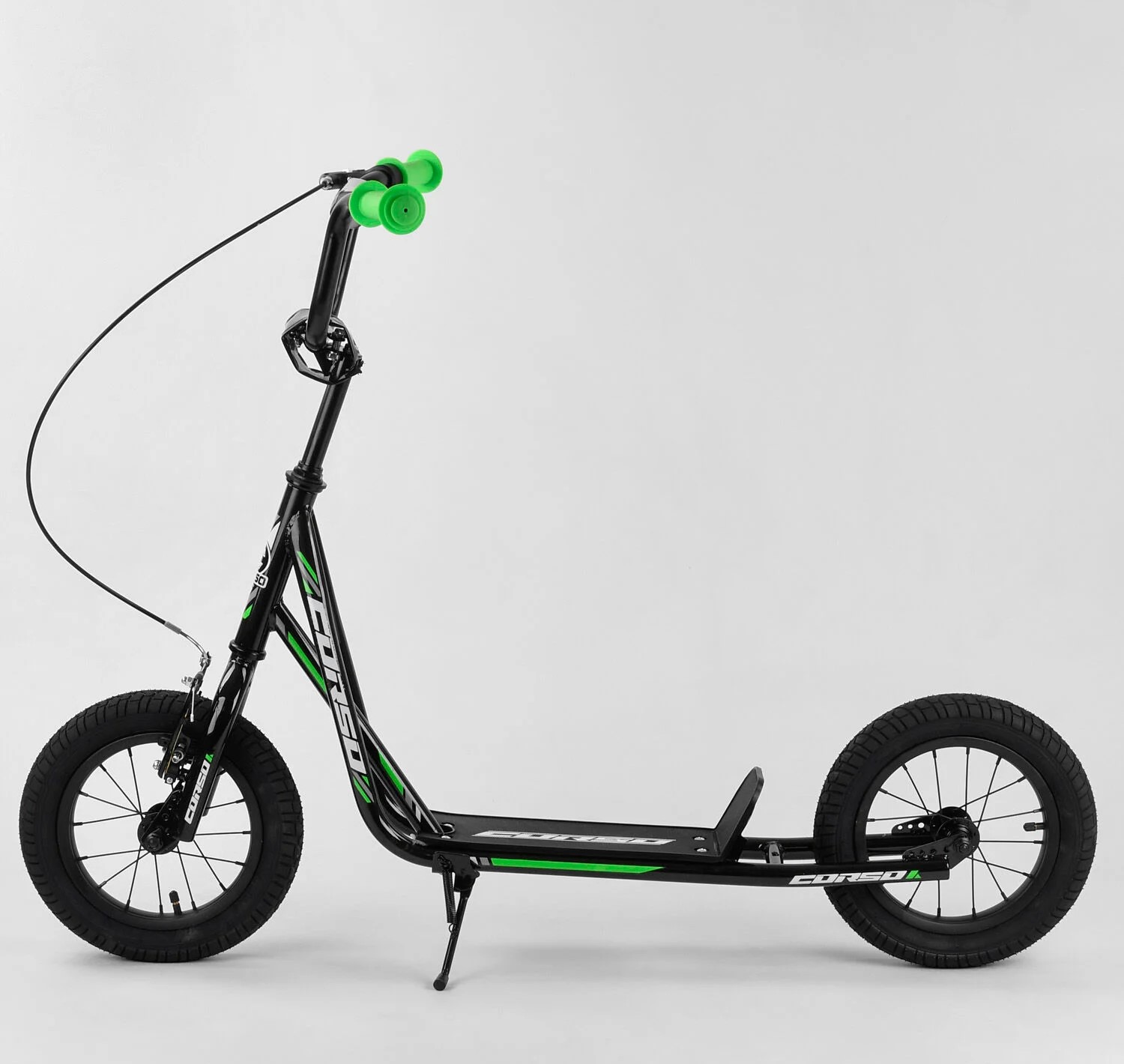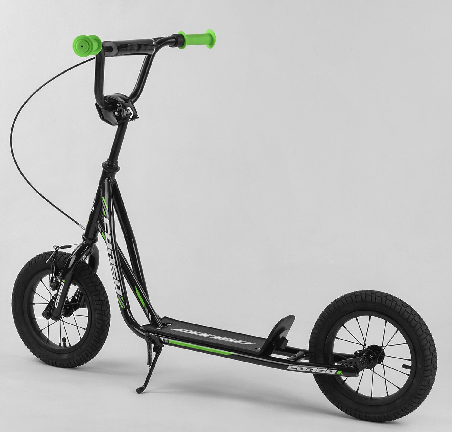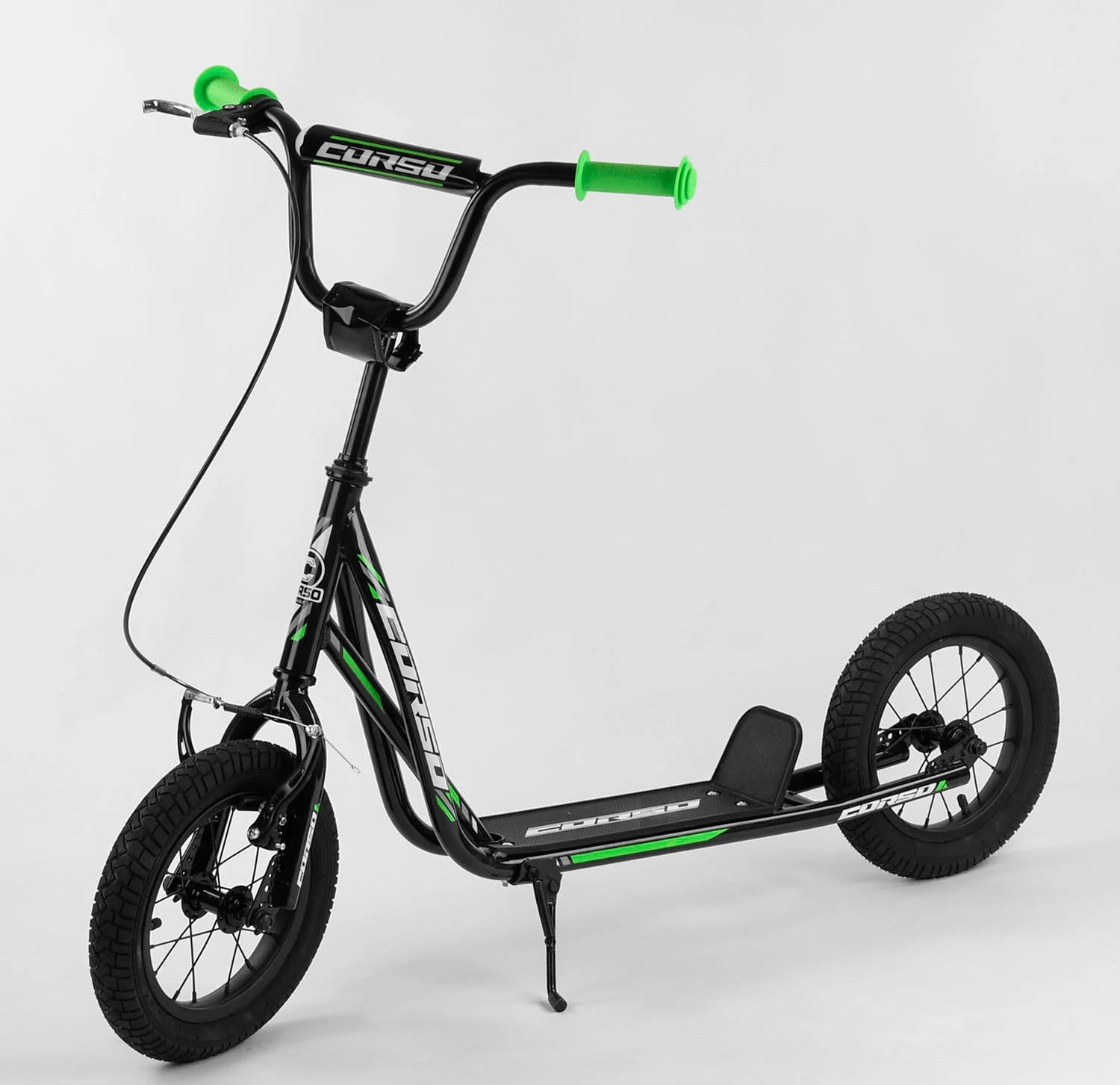Самокат дитячий 2-х колісний, надувні колеса 12 Corso JT 01019 чорно-салатовий, ручне переднє гальмо