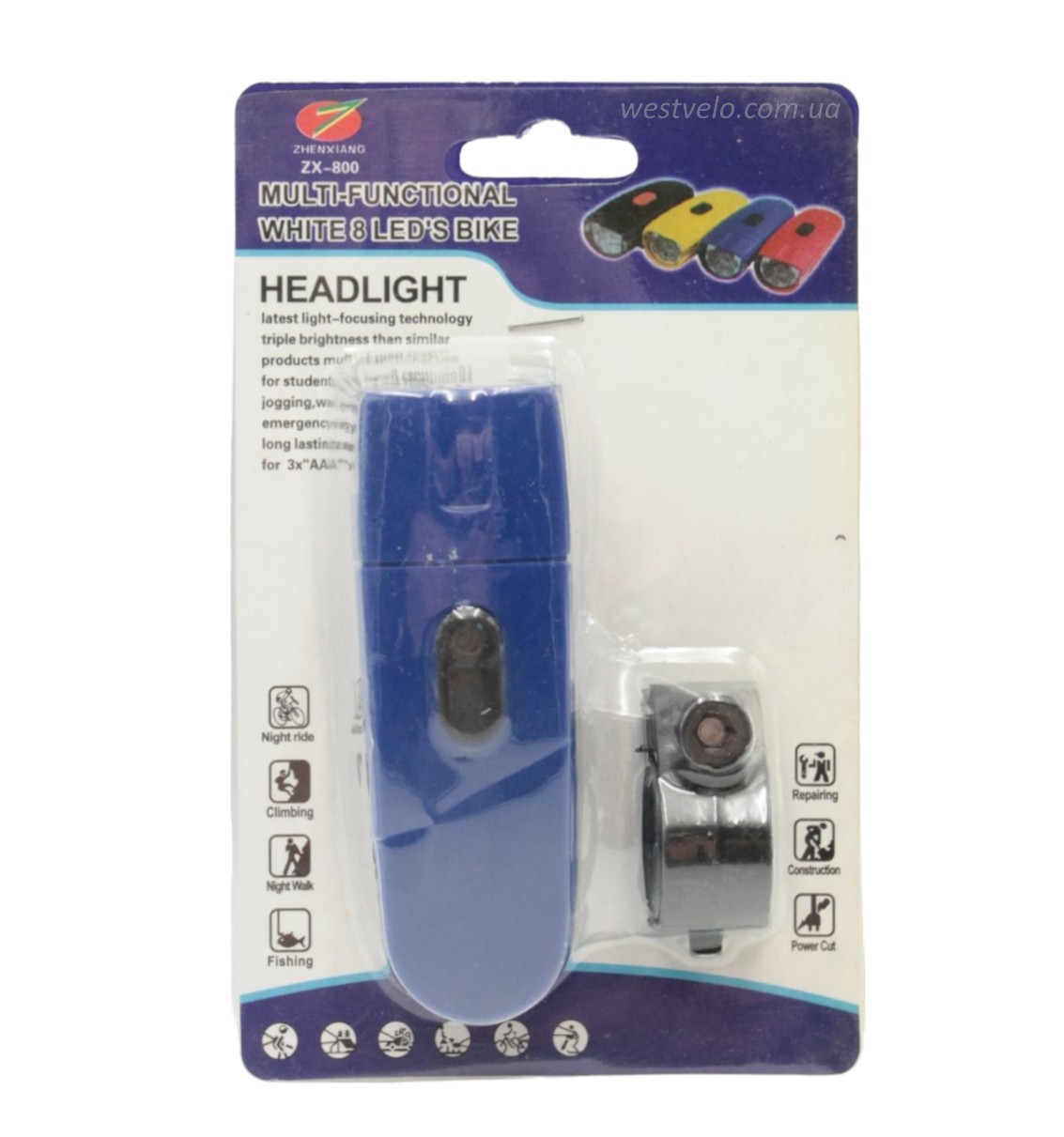 Фара на батарейках ZHEN XIANC (ZX-800), 8 LED (чорна, синя)
