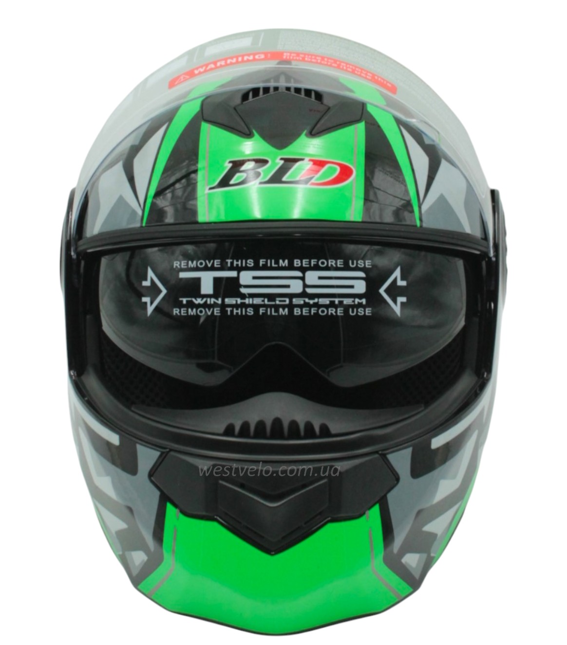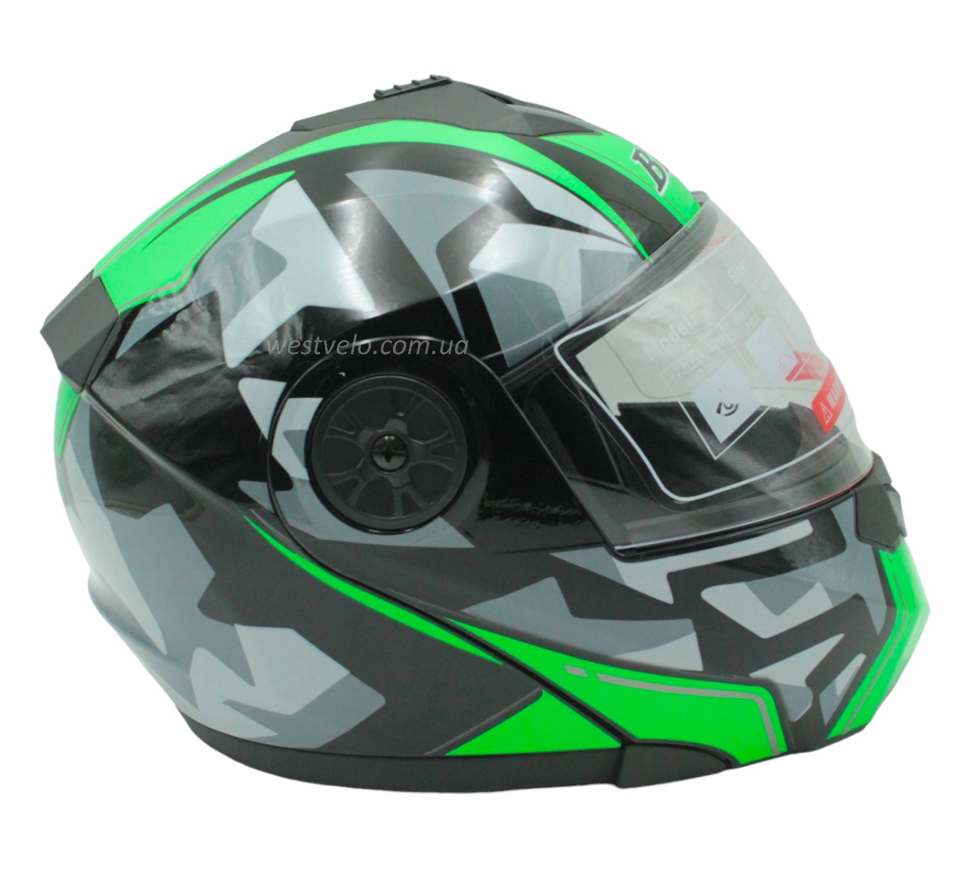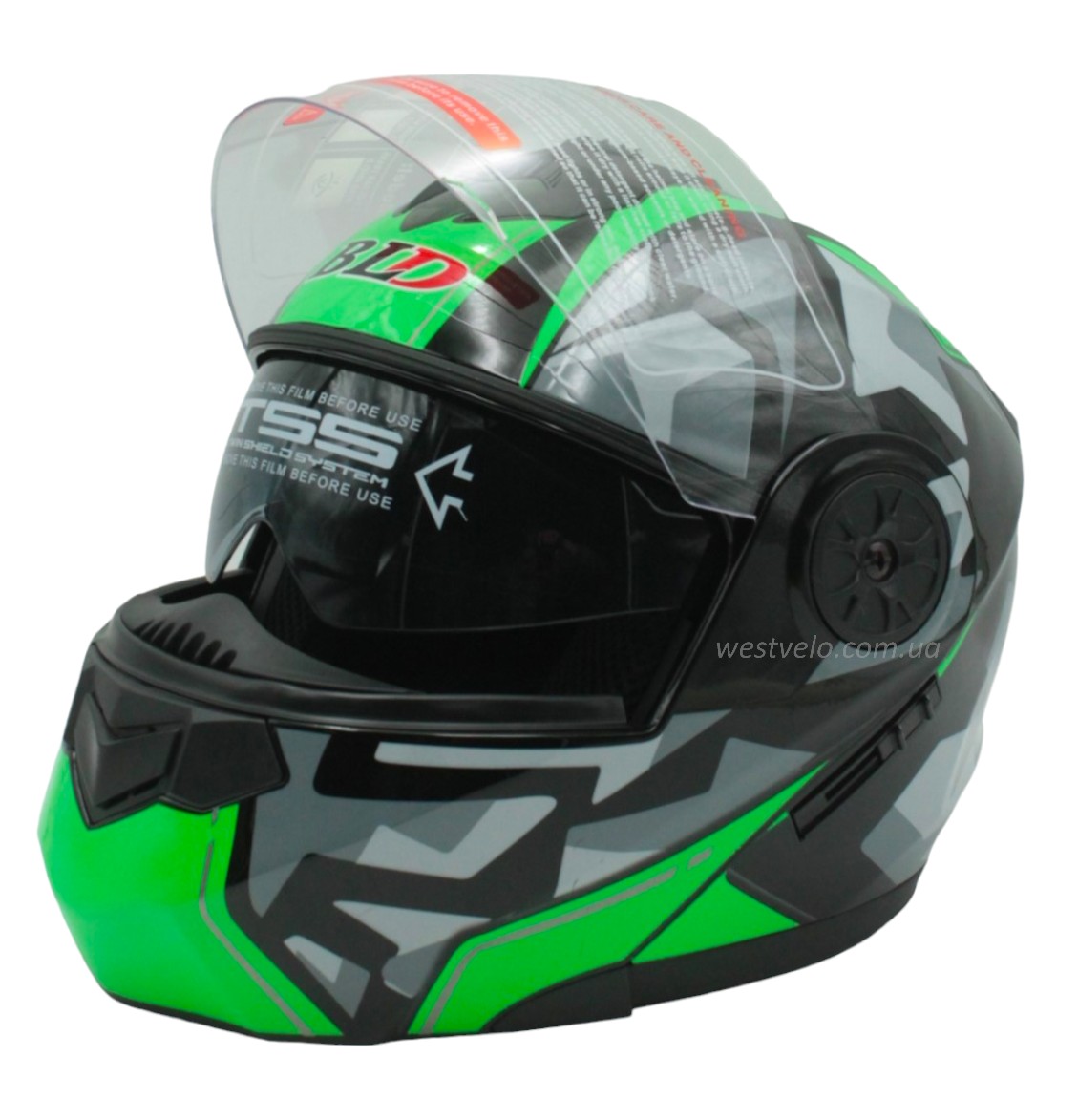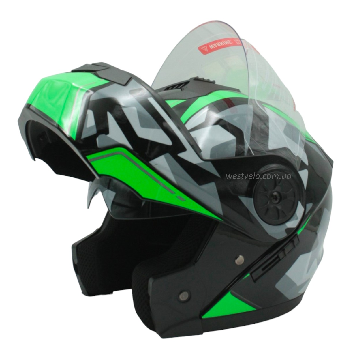 Мото шолом, трансформер (S 55-56) BLD-159 чорно-зелений глянець з відкидними окулярами
