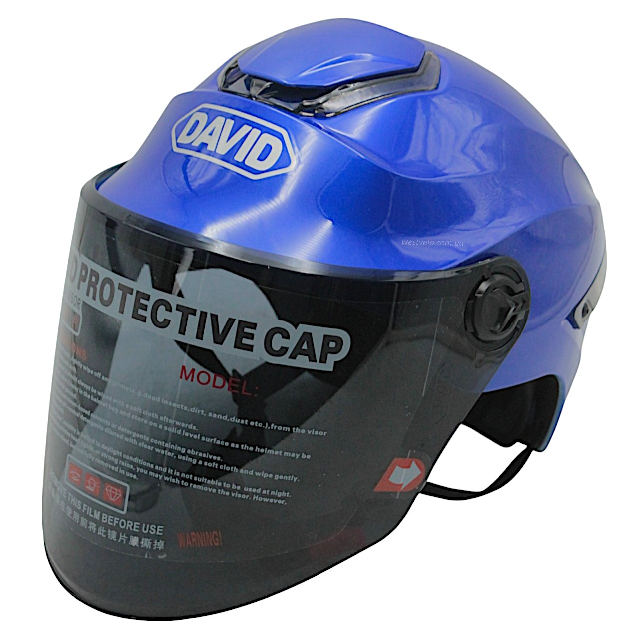 Мото шолом, відкритий "DAVID" S307, синій глянцевий тоноване скло, регулятор розміру з білим катафотом (ABS)