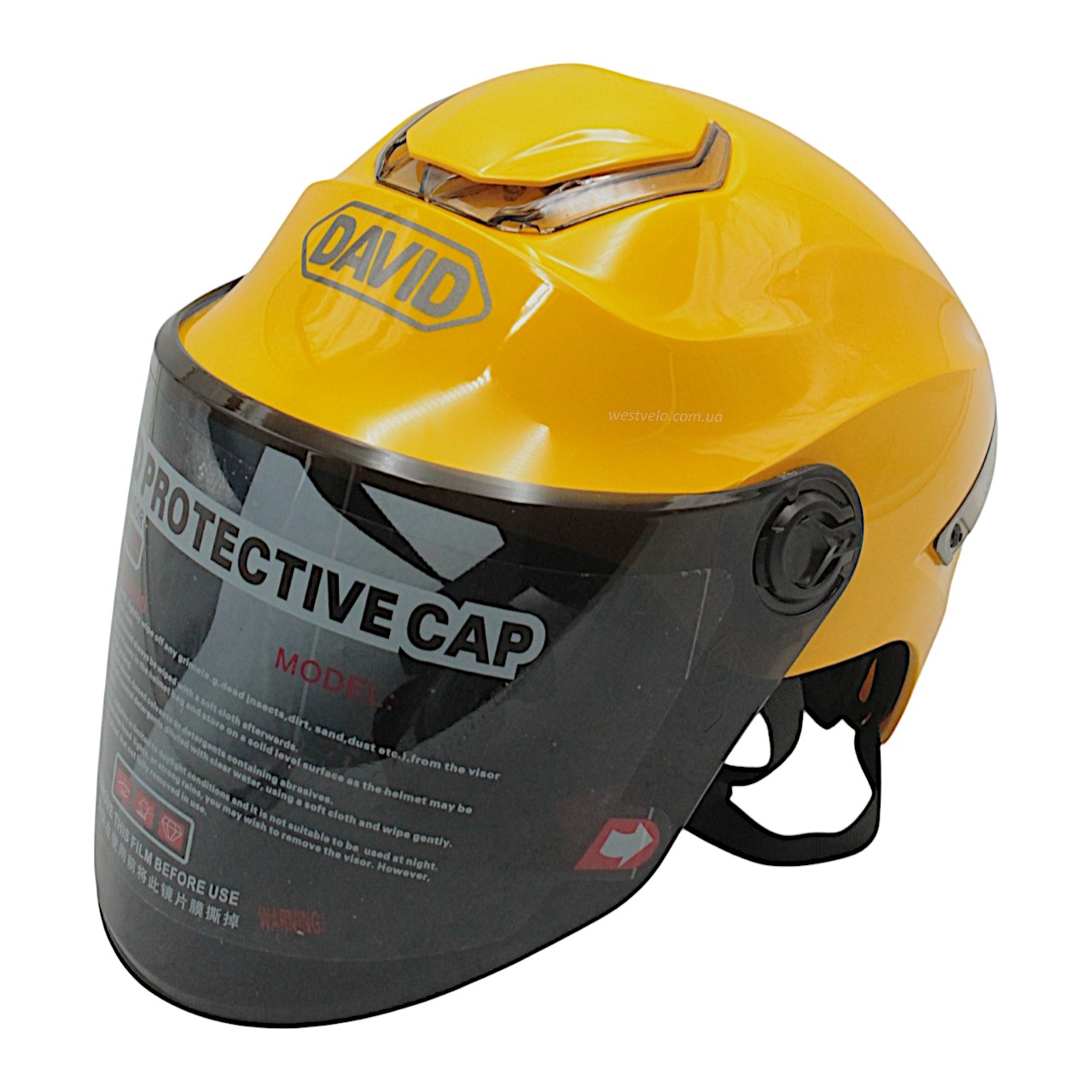 Мото шолом, відкритий "DAVID" S307, жовтий глянцевий тоноване скло, регулятор розміру з білим катафотом (ABS)