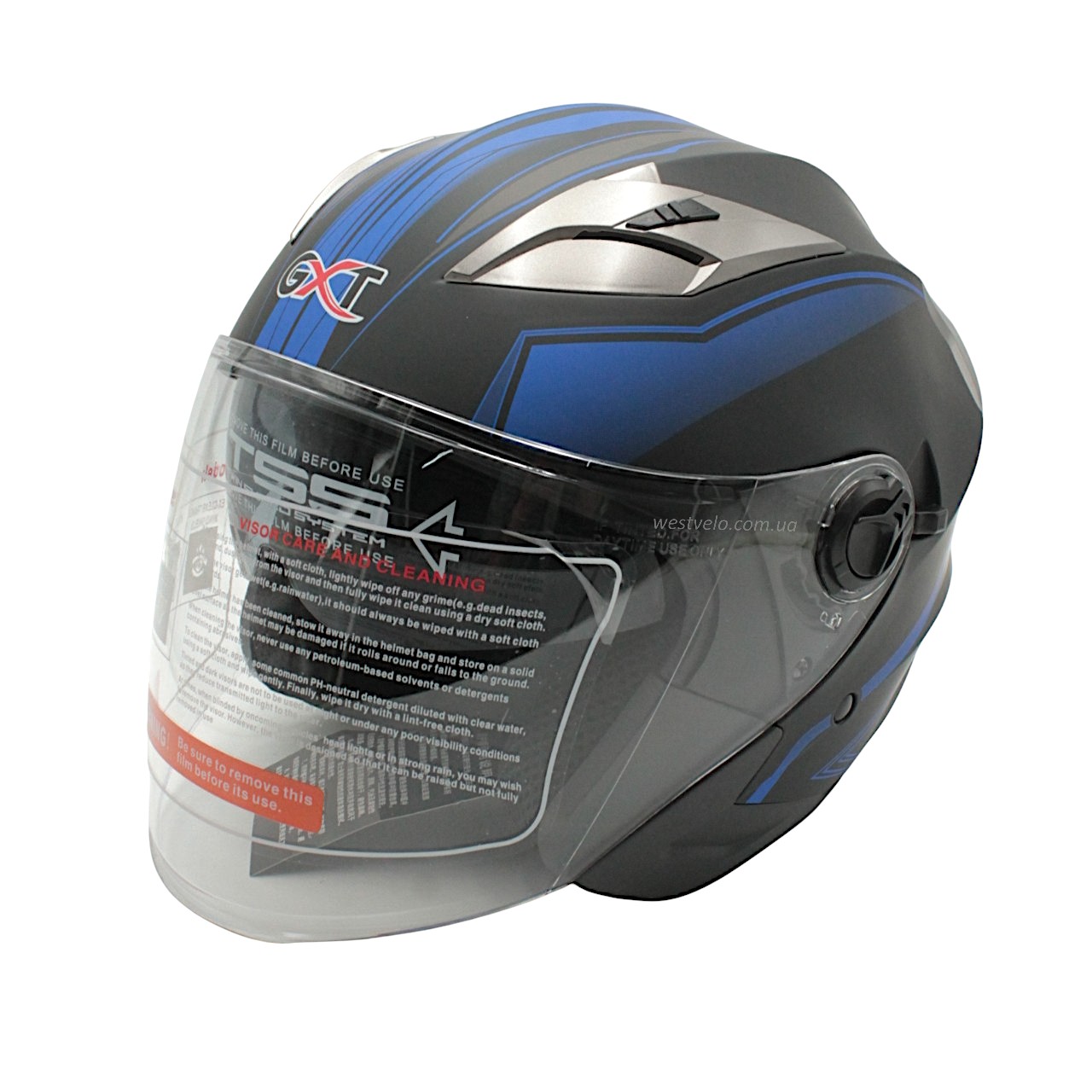 Мото шолом, відкритий (M) GXT "1001-1", чорний матовий з синіми вставками з відкидними окулярами