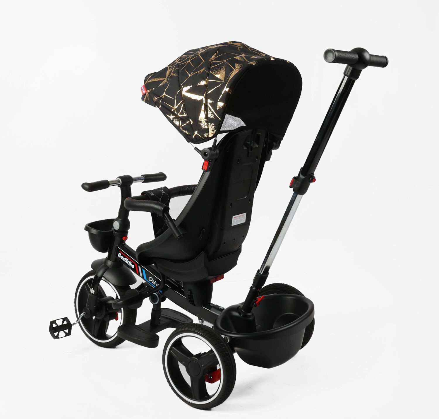 Дитячий велосипед 3-кол з батьківською ручкою, з даш, PU BestTrike «OSCAR» 6390/16-098 чорно-золотий, поворотне сидіння, складне кермо, кошик, телескопічна ручка
