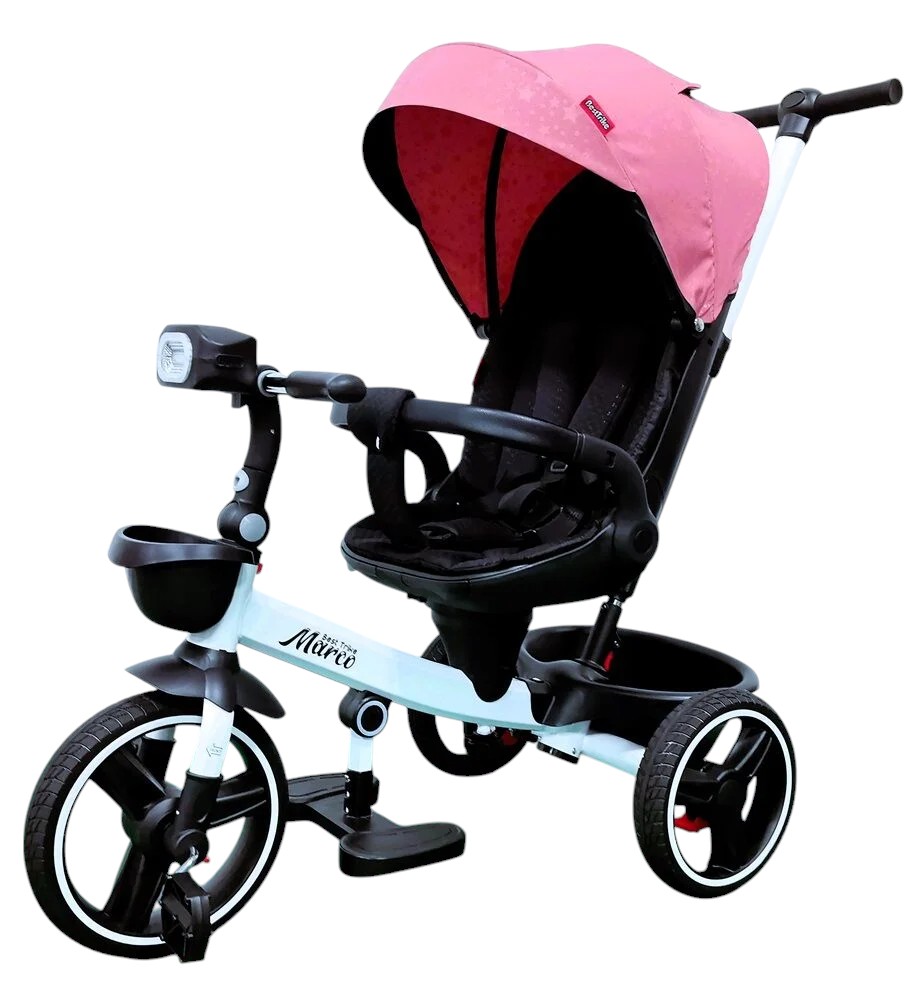 Дитячий велосипед 3-кол з батьківською ручкою, з даш, PU BestTrike «MARCO» 9155/345-62 біло-рожевий, поворотне сидіння, складне кермо, кошик, телескопічна ручка, фара музична