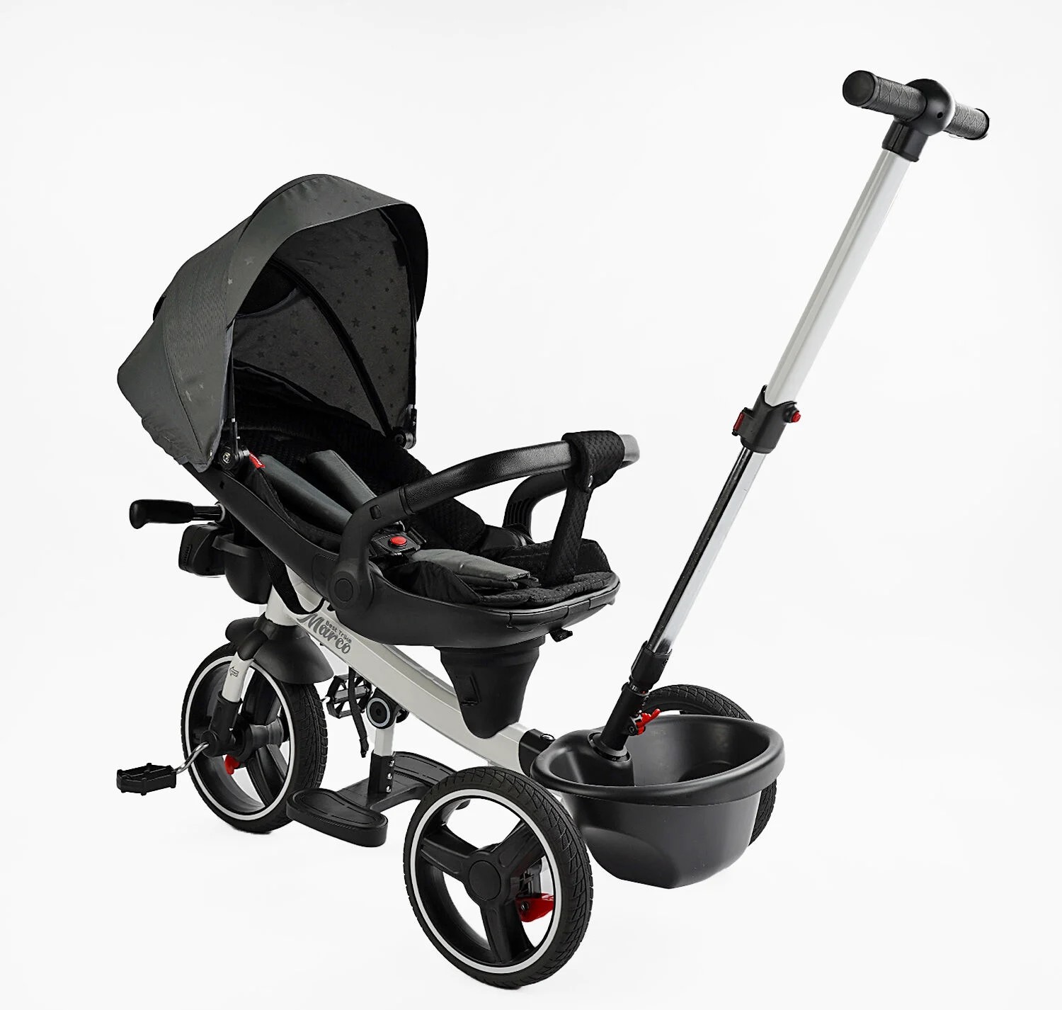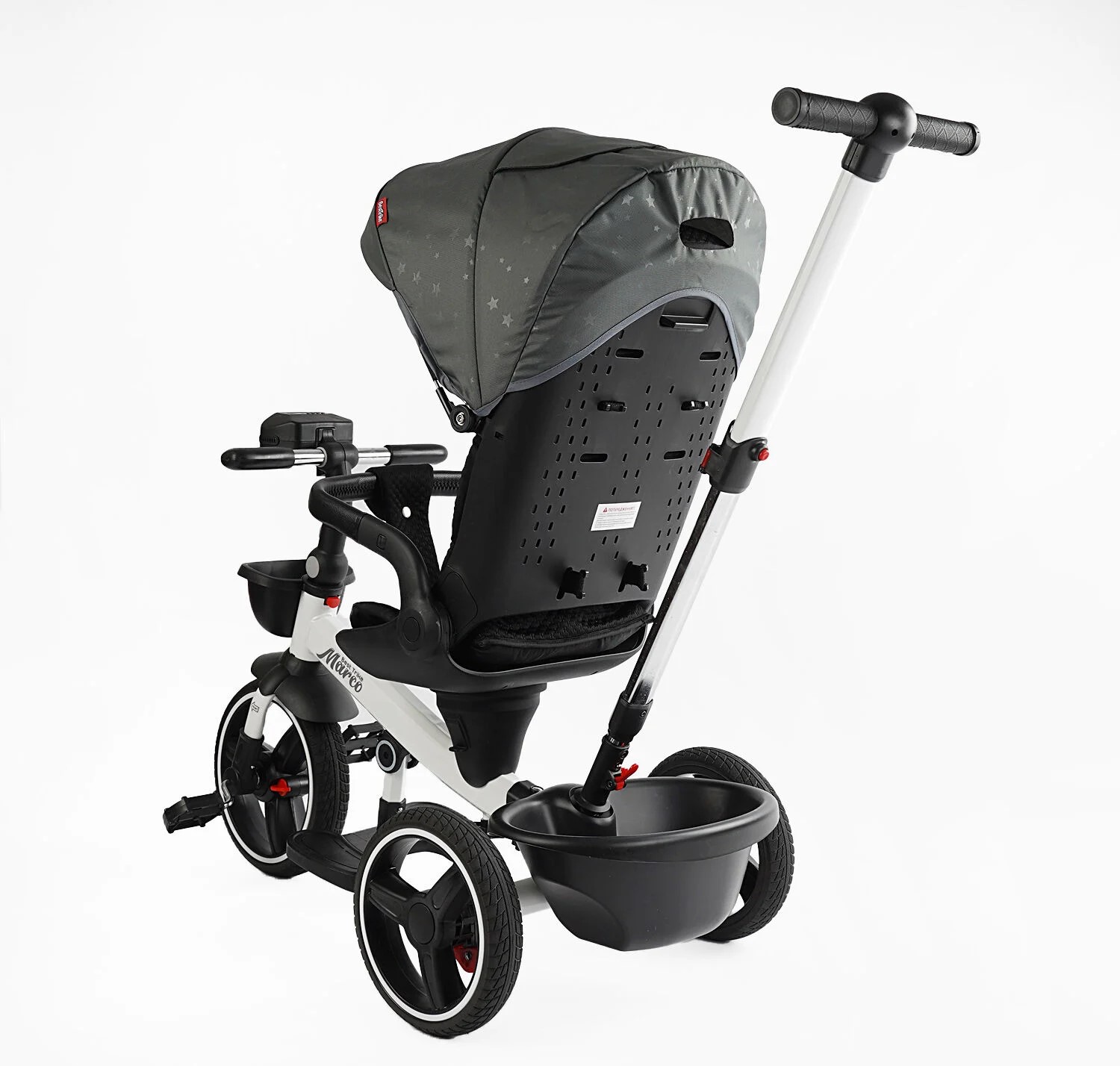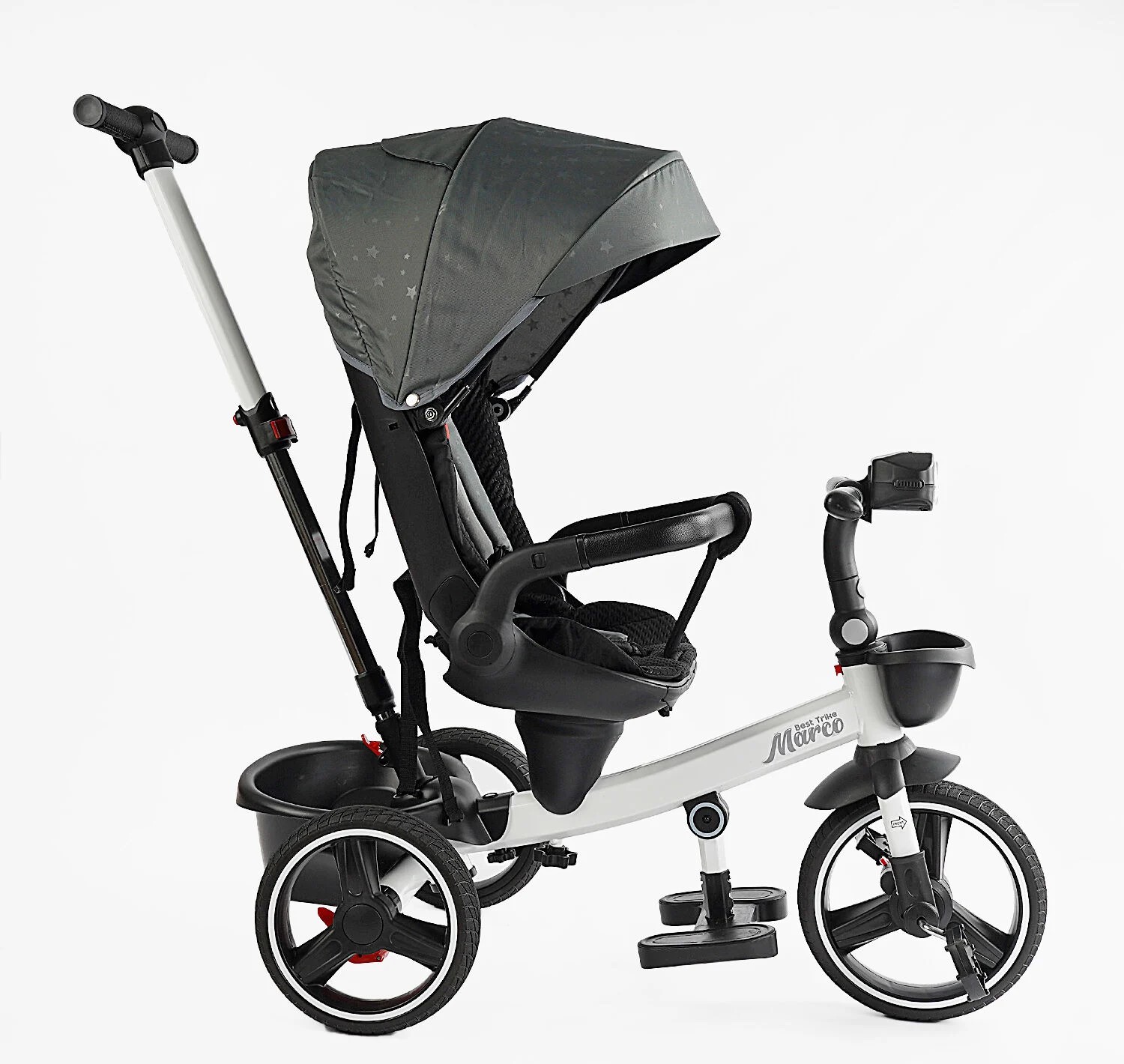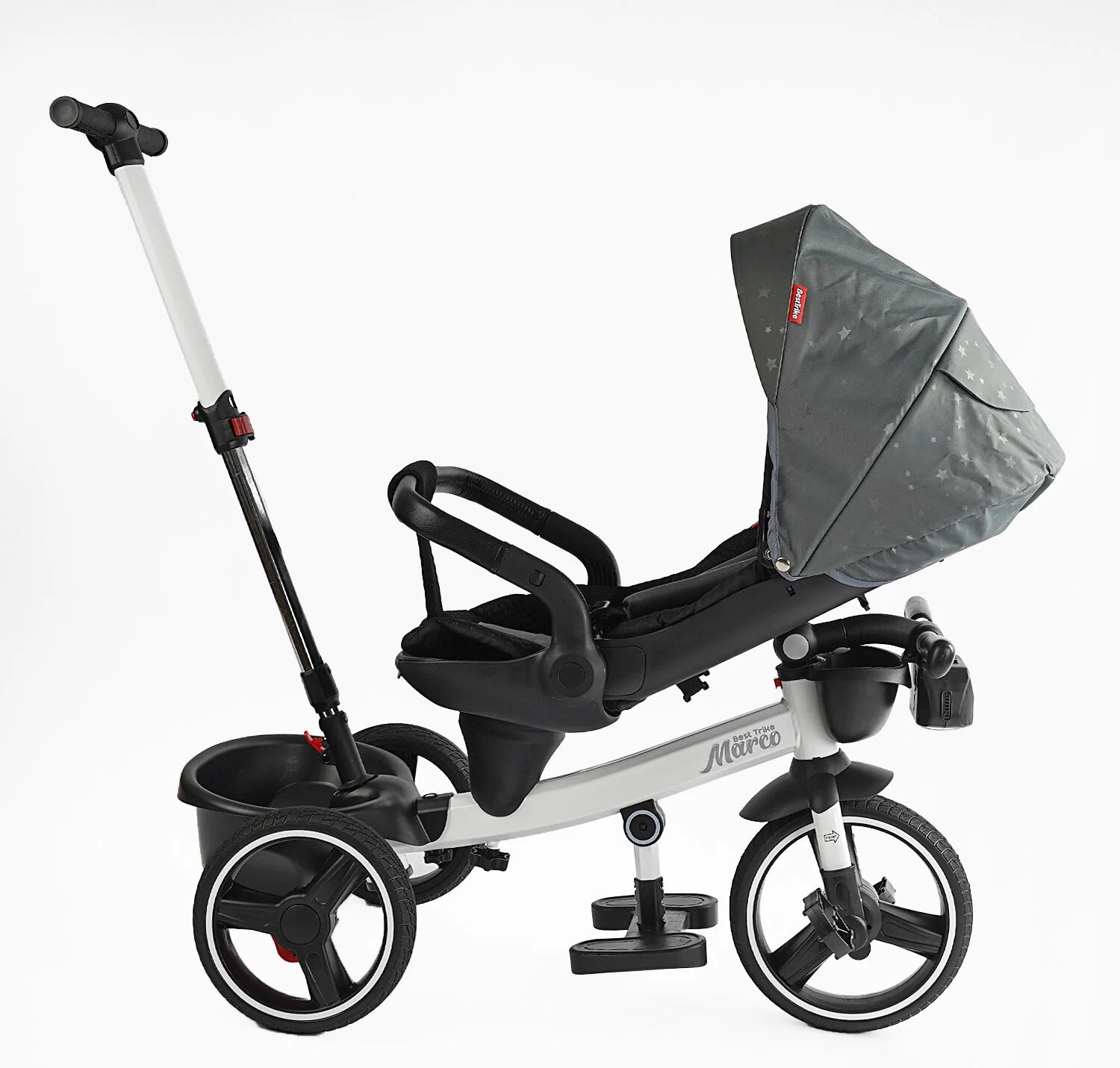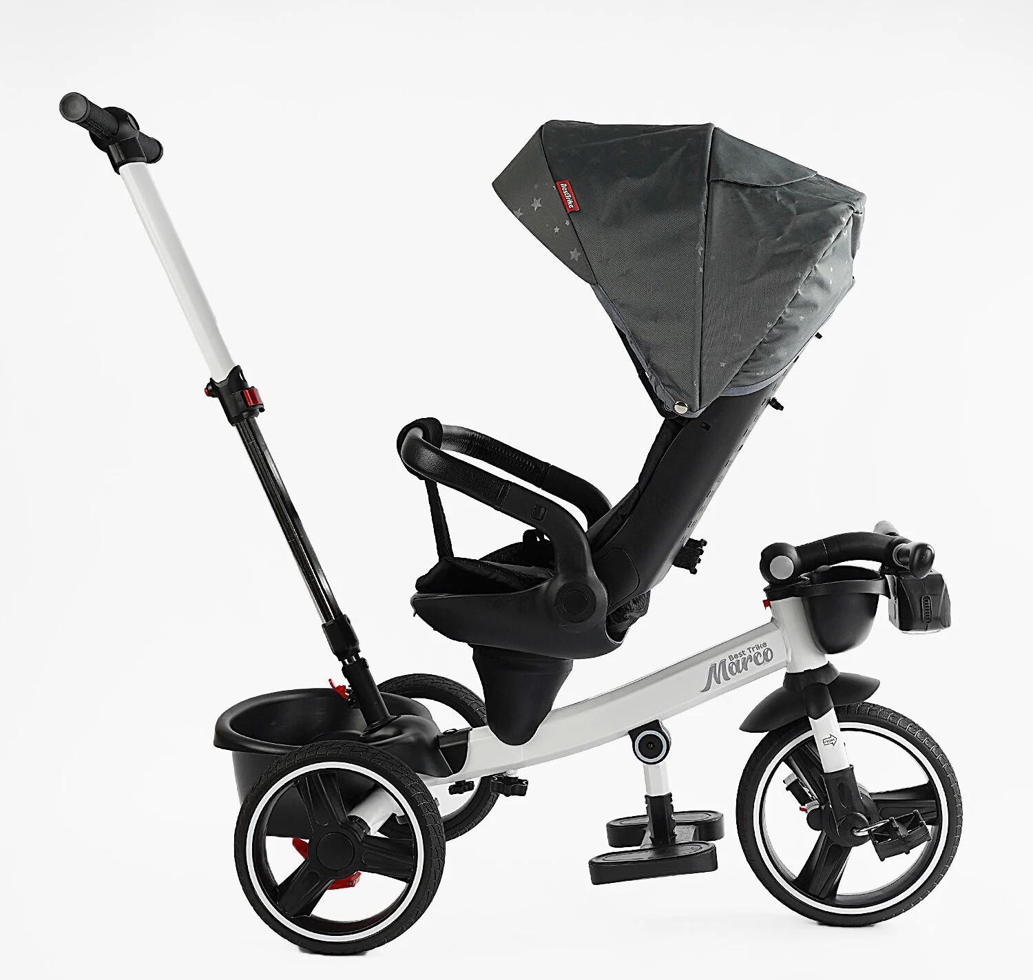 Дитячий велосипед 3-кол з батьківською ручкою, з даш, PU BestTrike «MARCO» 9155/603-85 біло-сірий (зірочки), поворотне сидіння, складне кермо, кошик, телескопічна ручка, фара музична