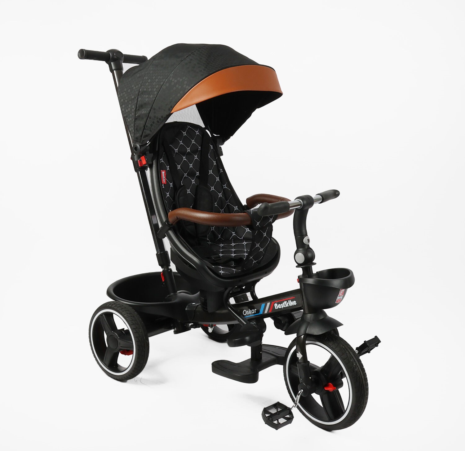 Дитячий велосипед 3-кол з батьківською ручкою, з даш, PU BestTrike «OSCAR» 6390/24-115 чорно-коричневий, поворотне сидіння, кермо складне, кошик, телескопічна ручка