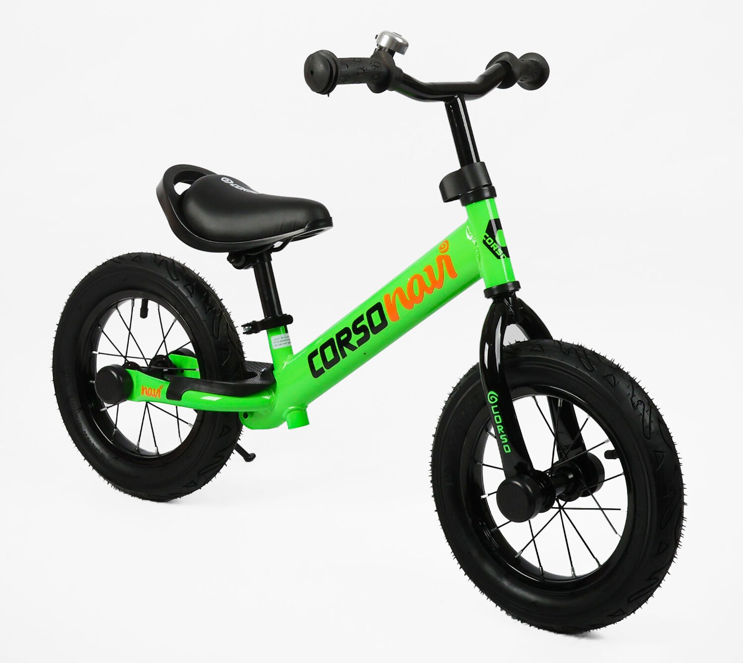 Велобіг 12 Corso надувні колеса, сталева рама «NAVI» NV-67010 салатовий, підніжка, підставка для ніг, дзвіночок
