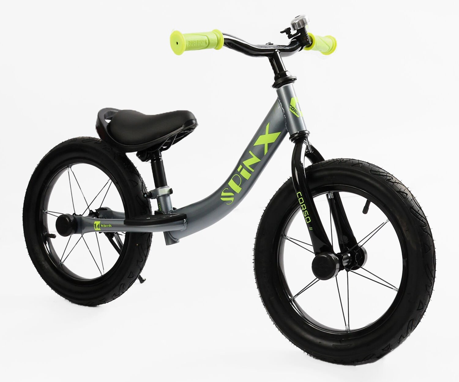 Велобіг 14 Corso надувні колеса, сталева рама «SPIN-X» PX-392-86 графітово-салатовий, підніжка, підставка для ніг, дзвіночок