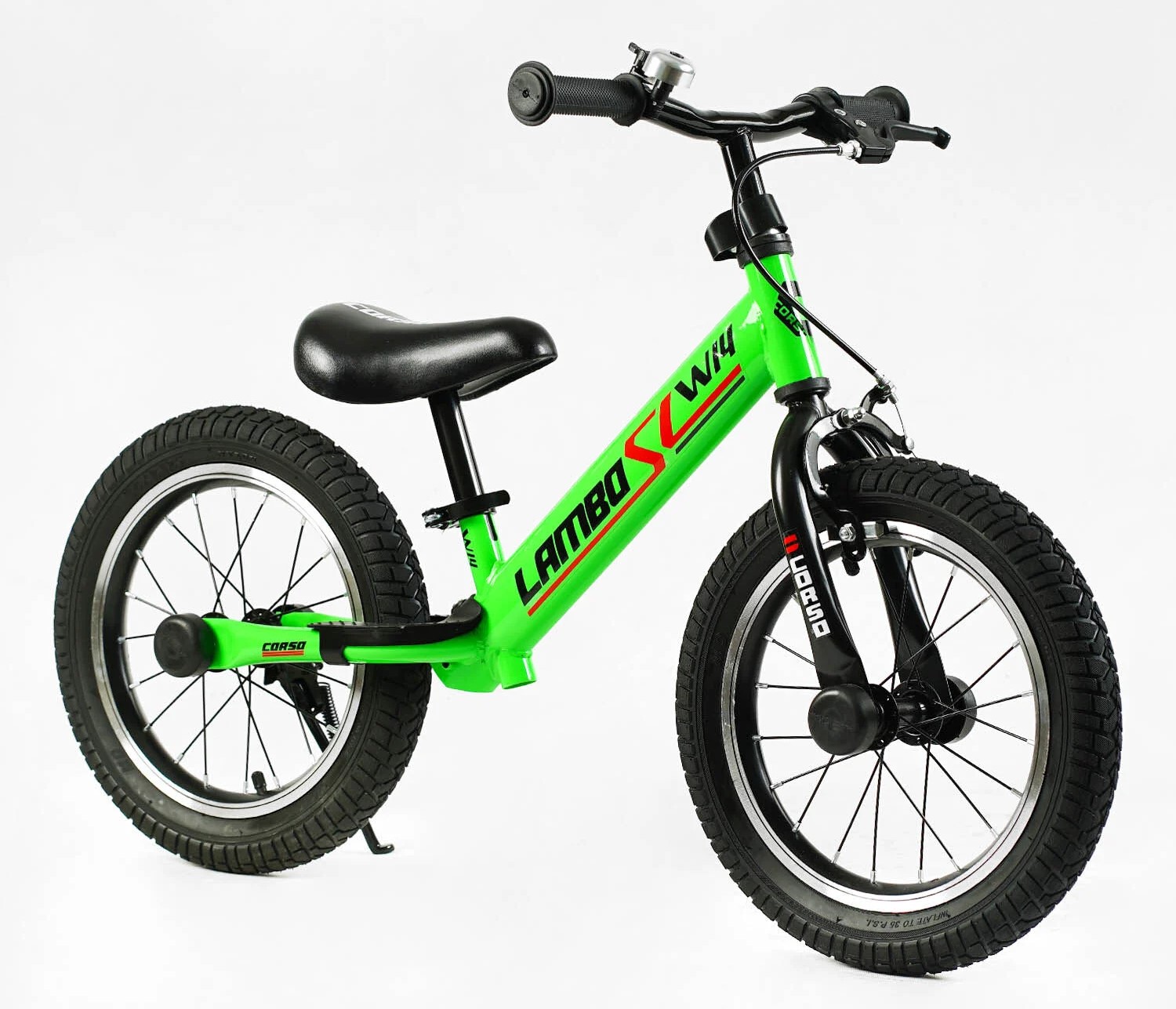Велобіг 14 Corso надувні колеса, сталева рама «LAMBO» LB-14700 салатовий, ручне гальмо, алюмінієві обода, підставка для ніг, підніжка, дзвоник